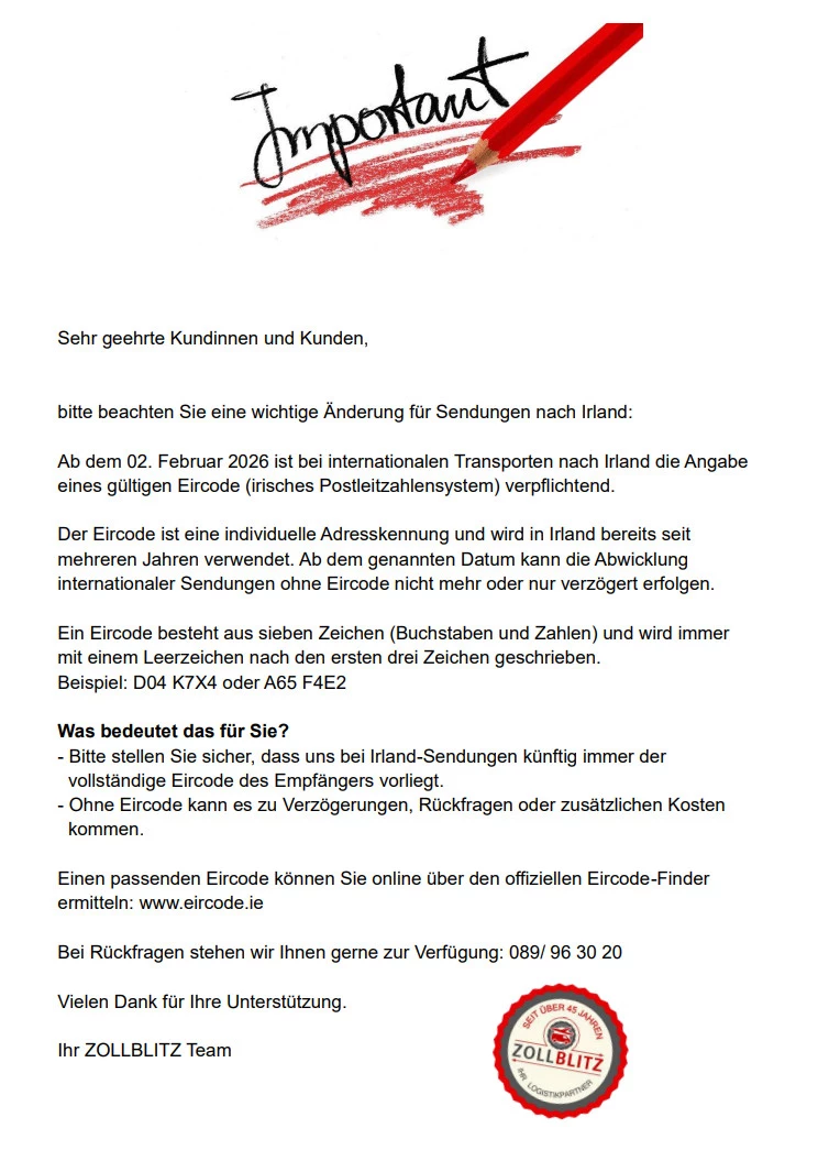 Ab dem 02. Februar 2026 ist bei internationalen Transporten nach Irland die Angabe eines gültigen Eircode (irisches Postleitzahlensystem) verpflichtend.
